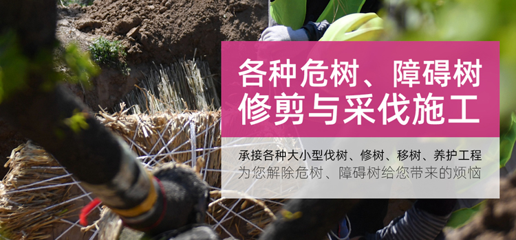 本公司具有高水平的施工隊伍、先進的采伐工具,高超的高空作業技術、誠信的服務,完善的管理。常年承接各種大小型伐樹、修樹、移樹、養護工程。常年為各大倉庫、部隊院校、工廠和小區物業進行樹木的修剪及采伐施工,為您解除危樹、障礙樹給您帶來的煩惱,真誠尋求各單位綠化隊的合作與支持。